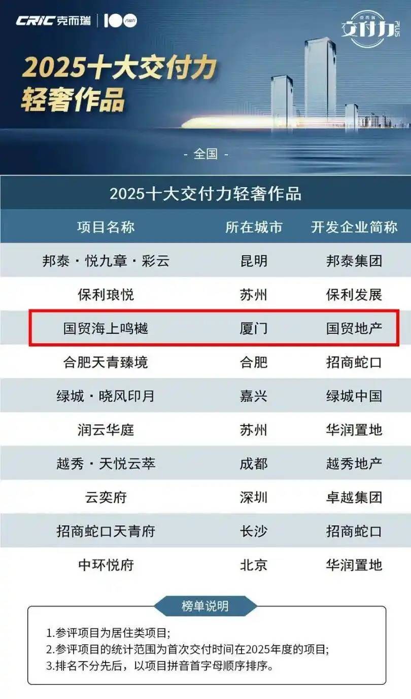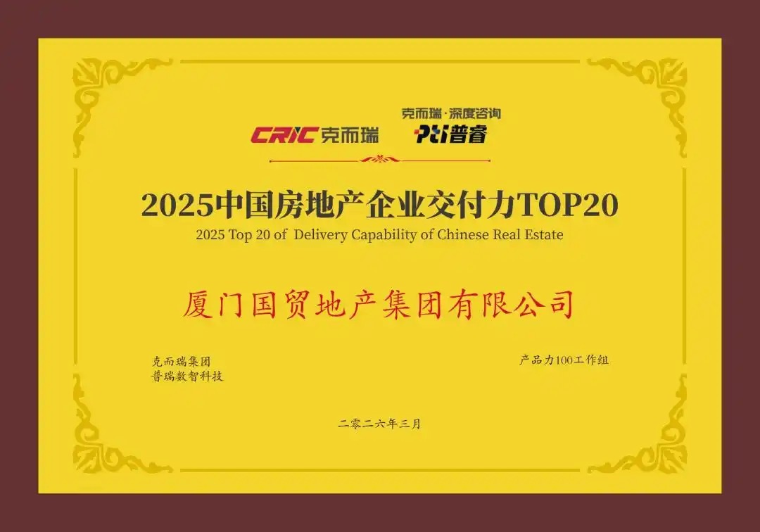 近日,2026年房地产开发企业系列研究成果正式发布,在交付力细分领域,国贸地产凭借卓越的交付表现与扎实的产品兑现能力,获评“2025中国房地产企业交付力TOP20(第18位)”,较上期榜单提升了7个位次。旗下开发项目国贸海上鸣樾入选“2025十大交付力轻奢作品”。