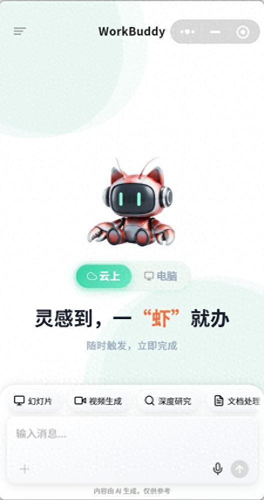 据介绍,WorkBuddy支持"云端+本机"双模式运行。这次更新,相当于把一整套能干活的AI,完整搬进微信:支持云端沙箱与本地电脑远程执行双模式,手机上用语音、拍照、传文件就能直接派活,生成的文档、PPT、视频可以一键下载、随手转发。